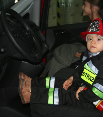 Do remizy Szkoły Podoficerskiej Państwowej Straży Pożarnej przyjechaliśmy przed południem. Franek został oficjalnie przywitany przez kapitana i zaprowadzony do miejsca, gdzie przebrał się w otrzymany od nas strój strażaka (wyglądający bardziej autentycznie niż te, które mieli na sobie dorośli strażacy), hełm, gaśnicę (działającą na wodę) i kilka innych strażackich gadżetów.