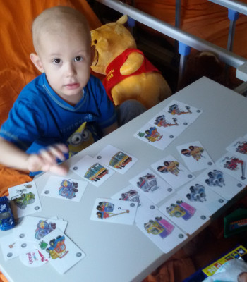 Tak więc Hubercik ubiegł mnie swoim sprytem. Jednak nie może być tak łatwo, bardzo chciałam poznać trochę bliżej Marzyciela, więc wręczyłam lodołamacz. Szybko znaleźliśmy wspólny język. Hubert ucieszył się bardzo na Kubusia Puchatka, a jeszcze bardziej na książeczkę z obrazkami i opowiadaniem oraz karty Piotrusia. Hubert wszystko dokładnie musiał zobaczyć. Z miejsca poprosił mamę, żeby mu poczytała. Po krótkiej lekturze ułożyłam jeszcze z Hubertem – Piotrusia. Hubert nauczył mnie rozpoznawać pojazdy – traktor, dźwig, walec drogowy, koparka, spychacz, itd… typowo męskie klimaty! Dlatego szybko przeszliśmy do tematu marzenia Huberta. Chłopiec wyjawił szczegóły swojego marzenia, czyli fakt, że najbardziej na świecie to chciałby grać na swoim tablecie w Angry Birds. Więc…. misja przyjęta! Do dzieła!