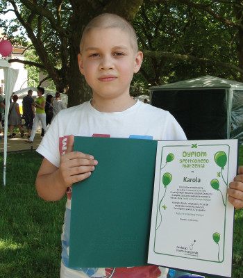 Rozłożyłyśmy wszystkie prezenty na trawie i czekałyśmy na telefon od mamy Karola. Po informacji, że nasz Marzyciel już jest poszliśmy po niego i przyprowadziliśmy w odpowiednie miejsce. Tam oznajmiliśmy mu, że to jest właśnie ten dzień, kiedy spełnia się jego marzenie. Karolek był przeszczęśliwy i od razu zaznaczył, że jak tylko brat mu wszystko wgra to już więcej go do swojego laptopa nie dopuści. Na pytanie w co będzie grał powiedział, że w grę przeglądarkową w której można tworzyć swoją własna farmę. Karol po kolei odpakowywał wszystkie prezenty. Oprócz laptopa Marzyciel dostał podkładkę chłodząca, z czego bardzo się ucieszył, bo powiedział, że ostatni laptop przegrzał się i spalił w szpitalu właśnie przez brak tego gadżetu, myszkę, która działa niezależnie od powierzchni na której się znajduje, plecak oraz grę na xboxa „Batman 3 Poza Gotham”. Oprócz tego dostał też od firmy Coloplast przepiękna kartkę, na której podpisało się wielu pracowników.